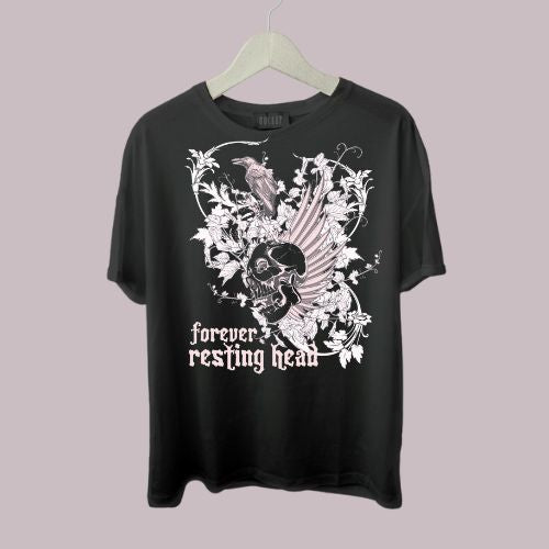 Step into the shadows with this artistic black gothic-style T-shirt, featuring a hauntingly beautiful print of a skull, angel wings, floral vines, and a perched raven. The phrase “forever resting head” adds a poetic touch to this mysterious and edgy tee – perfect for lovers of dark art, vintage vibes, and alternative fashion.